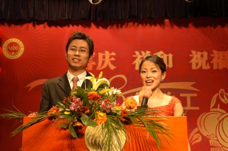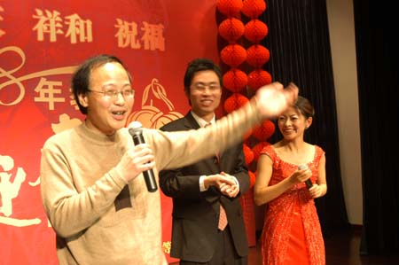 1月20日下午2点,我校教工迎新春团拜会准时举行。这是主持人宣布团拜会开始。