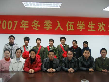 12月8日上午,在行政楼3楼会议室举行了我校2007年应征入伍学生欢送仪式。校党委副书记杨俊杰出席仪式并讲话。管理系党总支副书记周春芬、应用生物系党总支副书记卢培苗、中药系党总支副书记倪田金等有关系的学生工作负责人、各入伍学生的辅导员以及身着戎装的全体新兵和今年荣获三等功的退伍回校继续学习的老兵代表黄通行,一起参加了欢送仪式,仪式由校学生处副处长谢奇主持。