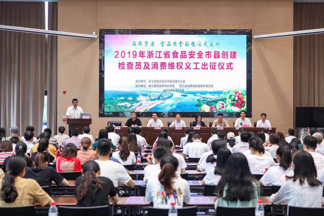 6月25日,浙江省食品安全市县创建检查员暨消费维权义工出征仪式在我校奉化校区行政楼111会议室隆重举行。省食品安全市县创建办公室副主任、省市场监督管理局副局长卢永福、省市场监督管理局食品安全协调处副处长潘欣、宁波市市场监督管理局副局长邵俊杰出席出征仪式。校长任文霞、副校长韩忠培、纪委书记方子祥、副校长罗文华、校工会主席金辉以及来自省消费者保护协会的消费维权义工、浙江省食品安全市县创建工作的检查员、师生代表共计一百余人参加出征仪式。出征仪式由金辉主持。