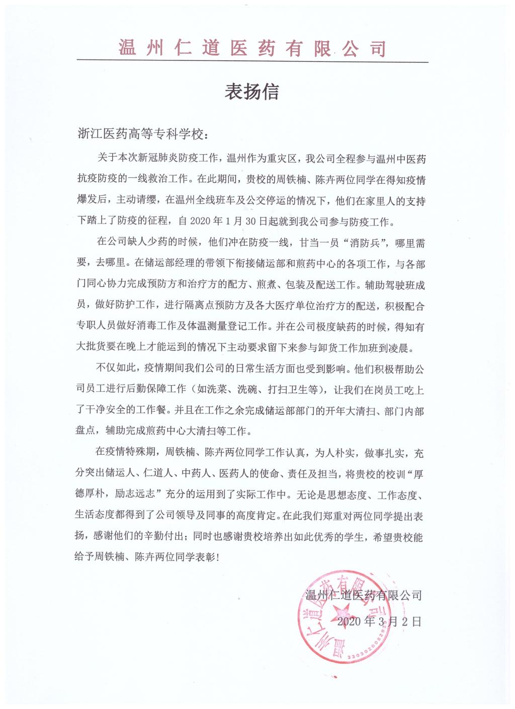 3月2日,我校中药学院实习指导教师孙媛收到温州仁道医药有限公司发来的一封感谢信,信中表扬D17中药4班周铁楠、5班陈卉两位同学,在公司实习带教师傅指导下,战斗在温州抗疫一线,加班加点,出色完成各项任务。