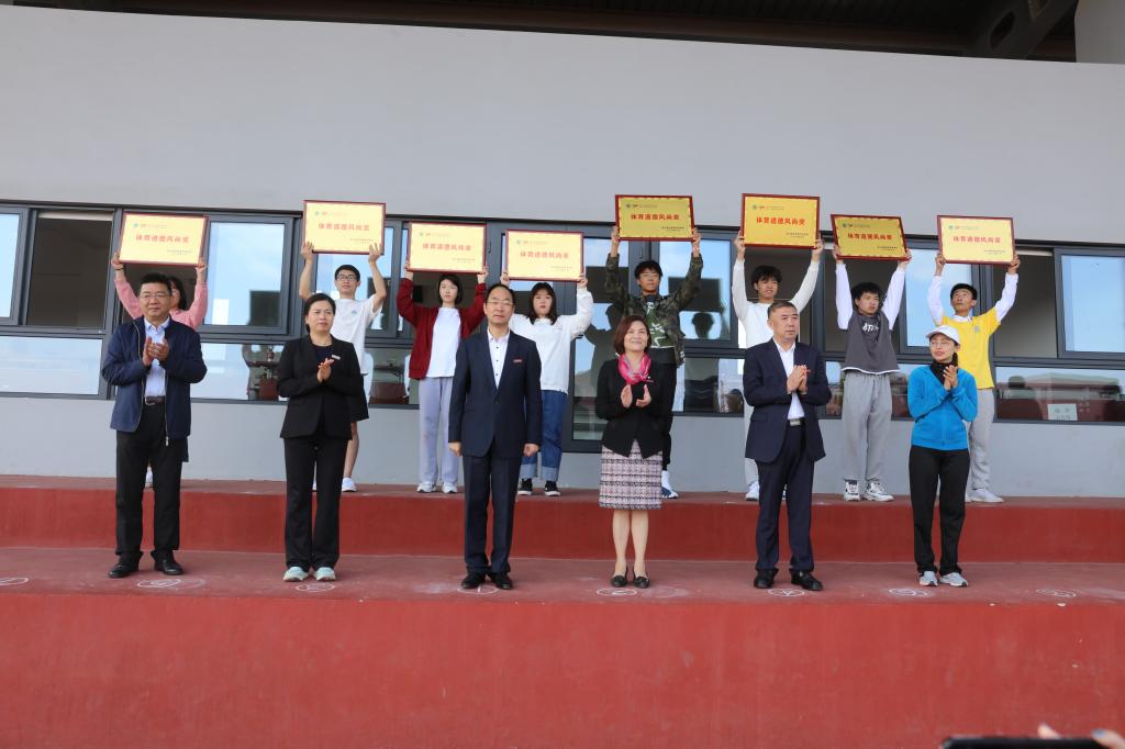 大会总裁判长张伟老师宣布本次运动会竞赛成绩,韩忠培宣布了获得“体育道德风尚奖”的评选结果。随后进行颁奖仪式,由校领导为各获奖代表队颁奖。
