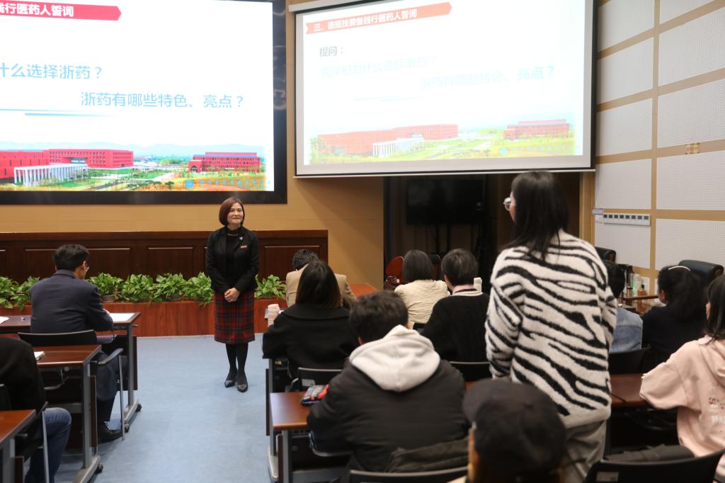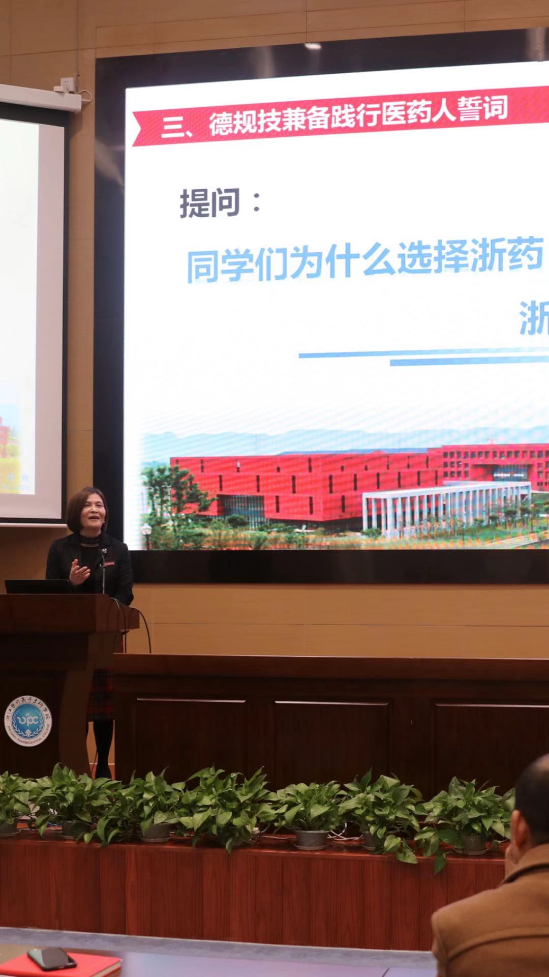 任文霞以“弘扬抗疫精神,勇担使命责任,做德规技兼备的新时代医药人”为题,在奉化校区为中药学院200余名学生以及基础学院部分思政教师讲授形势与政策课。在近1个半小时的的课程讲授中,任文霞从伟大抗疫精神的时代内涵、新时代医药人的使命与责任、德规技兼备践行医药人誓词等三方面切入,内容紧扣新时代高素质医药健康事业人才培养、伟大抗疫精神弘扬,倡导广大同学认真践行“医药人誓词”,努力做“德技并修、知行合一、笃志好学、勇担使命”的新时代浙药好学子。任文霞希望广大师生积极秉承“人民至上、生命至上、健康中国”的时代要求,认真践行“厚药德、明药规、强药技”的人才培养理念;高度认同中国制度、中国力量、中国优势;准确理解“新时代浙药学子使命担当”的时代内涵;切实感知为推进健康中国建设、医药强省建设、特色鲜明一流应用型院校建设的主体责任。任文霞勉励广大同学,医药事业是关系人民健康的头等大事,全体浙药学子要积极秉承医药人誓词,认真学好专业基础理论知识,努力培养独立思考和解决问题的能力,积极参与社会实践和志愿服务,全面提升个人综合素质能力。