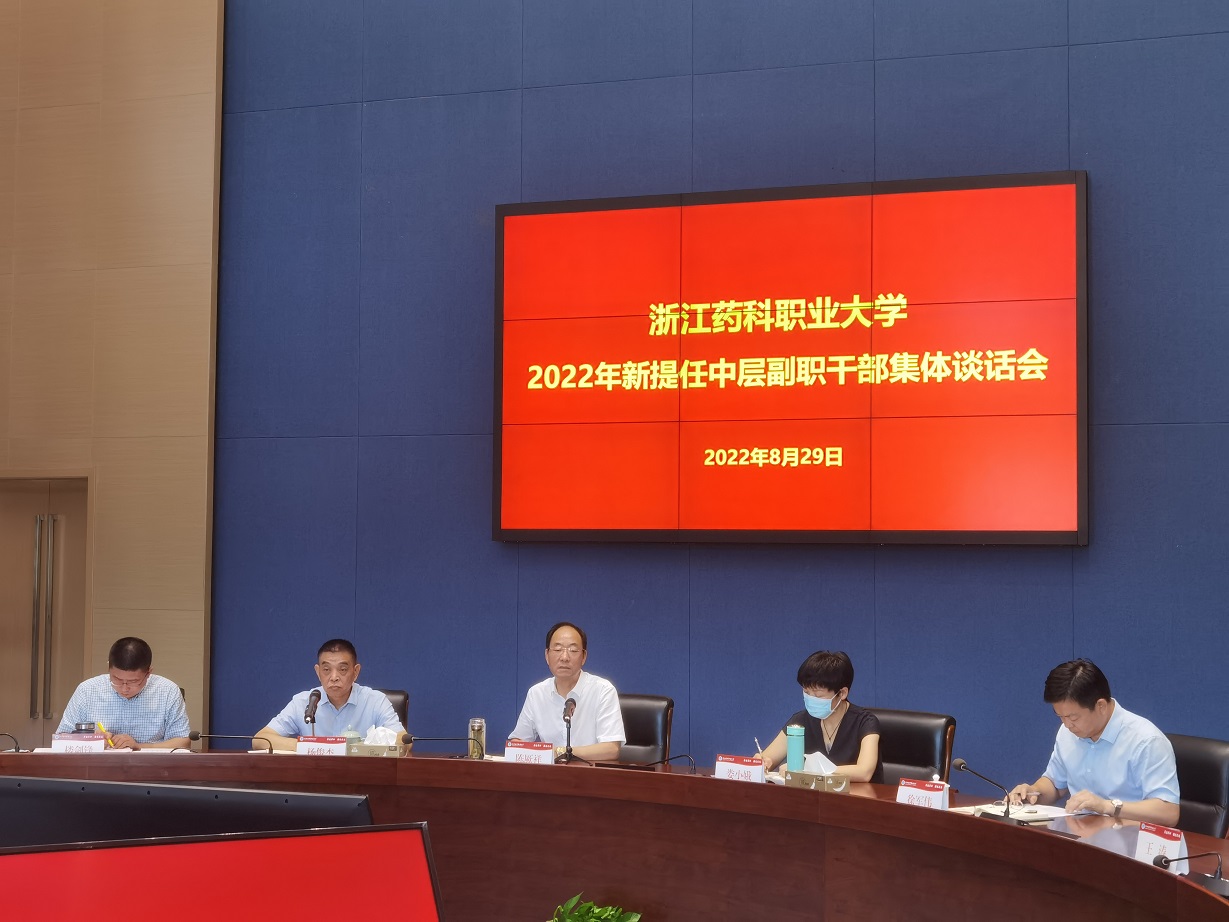 8月29日上午,学校2022年新提任中层副职干部集体谈话会在奉化校区行政楼举行。校党委书记陈厥祥,校长娄小娥,党委副书记杨俊杰,纪委书记徐军伟,党委委员、组织部部长楼剑锋及18名新提任中层副职干部参加会议。
