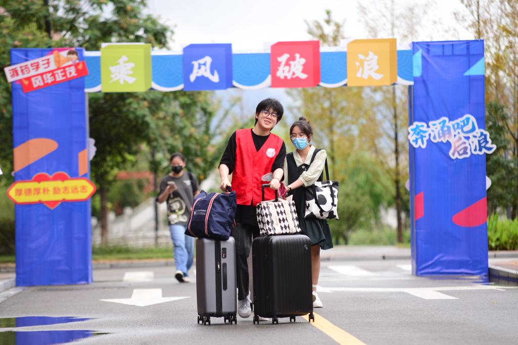 “同学你好,你是哪个学院的?录取通知书麻烦出示一下。”“学妹,你过来这边办理手续,然后可以出发去宿舍了。”在各个学院接待点,志愿者们正在查验与登记新生信息,收取疫情防控相关材料,报到现场井然有序。多位身穿红马甲的志愿者或为新生介绍报到流程、答疑解惑,或帮助搬运行李、引路指路等,迎着风雨奔行校园间,给予新同学们最大的热情与温暖。