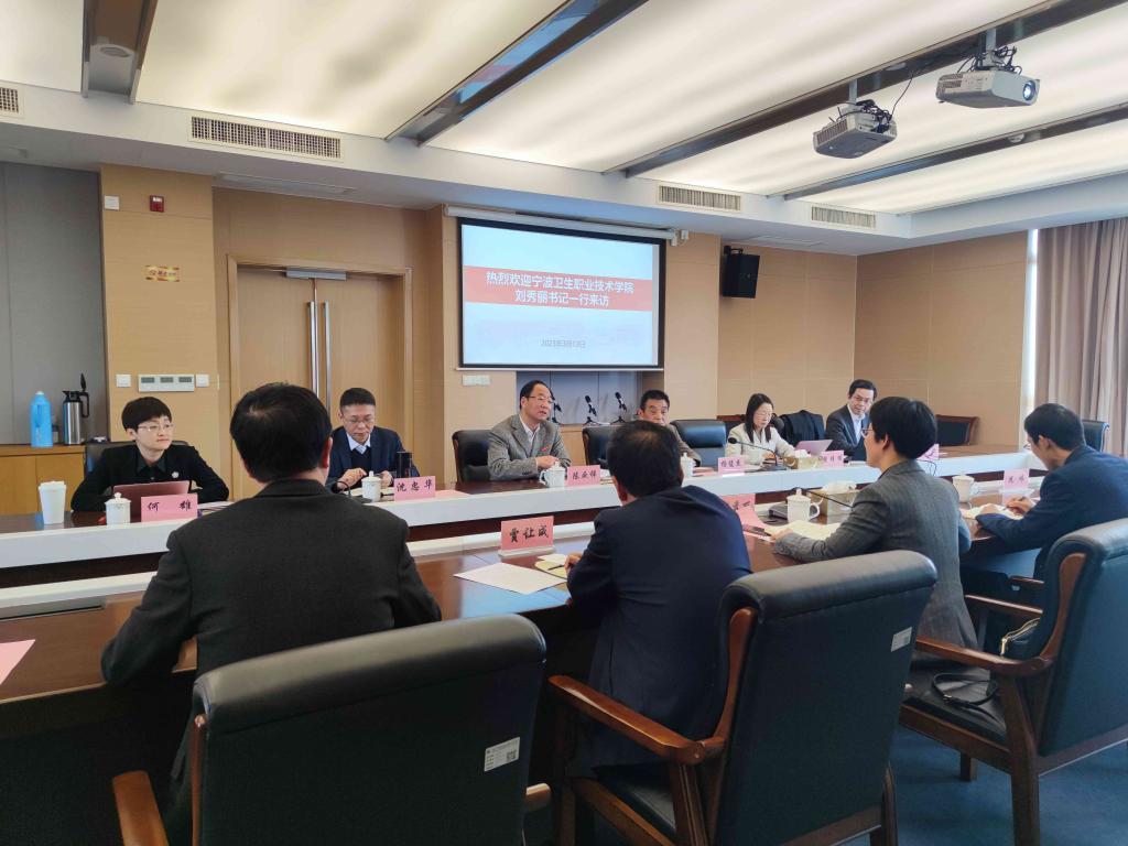 3月13日,宁波卫生职业技术学院党委书记刘秀丽,校长贾让成,副校长应志国,副校长郑禄红等一行访问我校。学校党委书记陈厥祥,党委副书记杨俊杰,副校长沈忠华等在行政楼热情接待来访,并就相关工作进行交流。