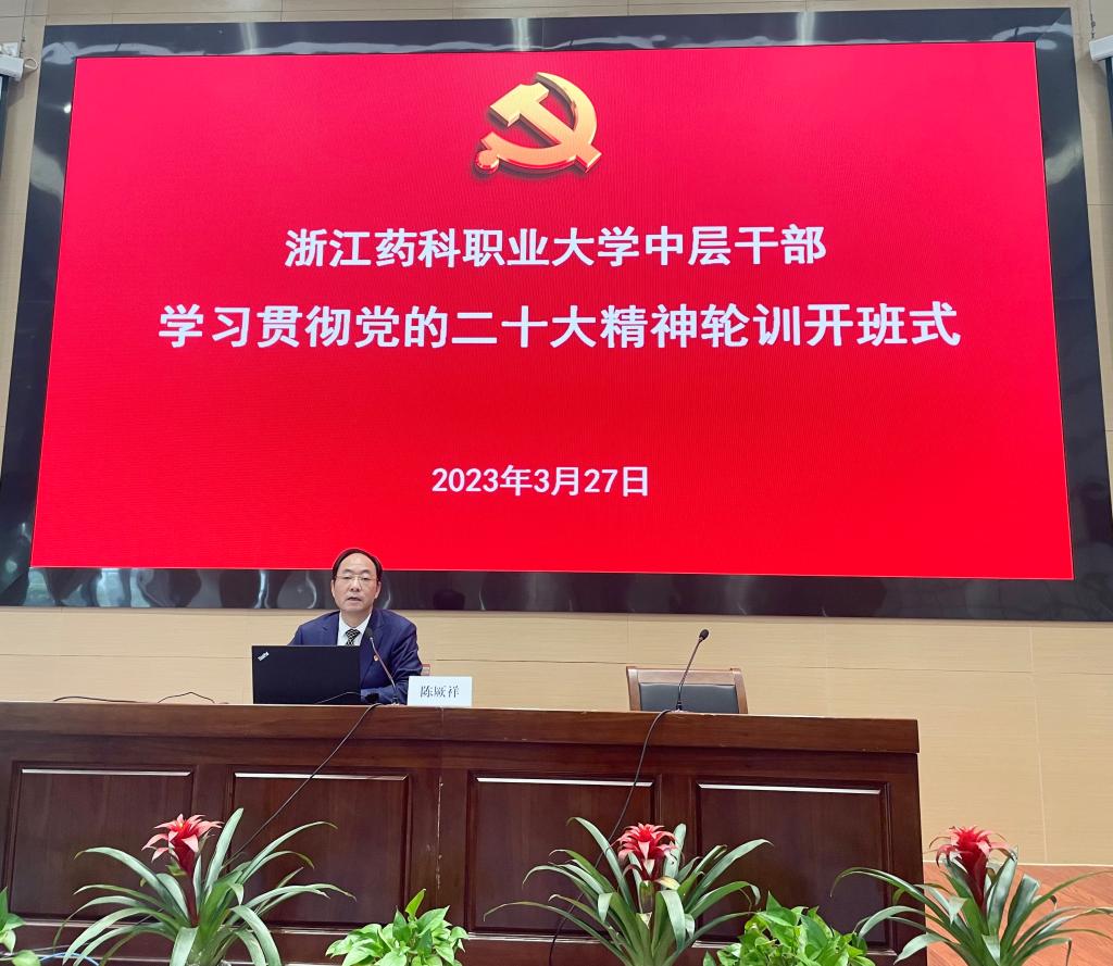 开班式后,陈厥祥以《围绕中心任务、聚焦首要任务、落实根本任务——在中国式现代化教育强国进程中书写浙药篇章》为题主讲了培训第一课,他强调:要紧紧围绕“党的中心任务、教育强国建设、一流大学目标”三个方面贯彻落实党的二十大精神,争取早日把学校建设成为医药特色鲜明的一流职业本科大学,在中国式现代化进程中构建“一体两翼三高地”的新格局。他指出:第一,要紧紧围绕党的中心任务,把党的二十大精神全面落实到立德树人的根本任务之中:我们应该而且必须,从习近平总书记对强国富民之本、中华民族伟大复兴之本的全局角度和政治高度加深对“务本强校创一流”的深刻理解,紧紧围绕党的中心任务,把党的二十大精神全面落实到立德树人的根本任务之中。第二,要紧紧围绕教育强国建设,积极投身到强教强校强院行动之中。他特别强调:强校为了谁——浙药人;强校依靠谁——浙药人;强校受惠谁——浙药人。作为全国第一所药科职业大学,我们都有责任和义务把学校建设成为医药特色鲜明的一流职业本科强校。这样的强校,主要应该包括两个五位一体,即五位一体的五个大学和五个浙药,具体来说就是以德立校、人才强校、特色亮校、文化铸校和依法治校;锋领浙药、学在浙药、技能浙药、数字浙药、清廉浙药。第三,要紧紧围绕一流大学目标,加快建设医药特色鲜明的一流职业大学:尽管创一流是一个持续向前推进、不断迭代升级的长期过程,但创一流人人可为、人人应为、人人能为,建设医药特色鲜明的一流职业大学没有局外人、没有旁观者、没有不可能,我们都应该从我做起、从本职做起、从现在做起,特别是中层干部更应该干在实处、走在前列、勇立潮头,努力成为创新深化、改革攻坚、开放提升的急先锋、排头兵、领头雁。