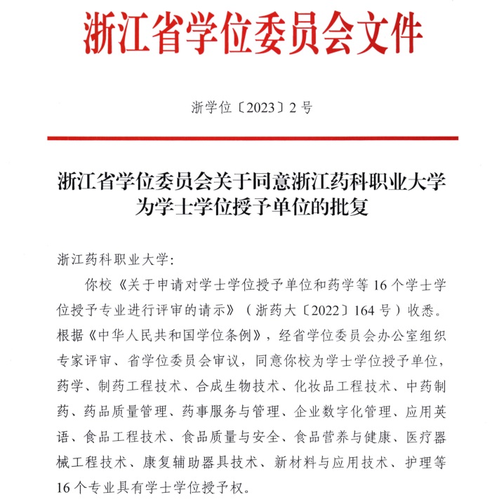 5月22日,浙江省学位委员会正式发文(浙学位〔2023〕2号)批复我校为学士学位授予单位,药学、制药工程技术、合成生物技术、化妆品工程技术、中药制药、药品质量管理、药事服务与管理、企业数字化管理、应用英语、食品工程技术、食品质量与安全、食品营养与健康、医疗器械工程技术、康复辅助器具技术、新材料与应用技术、护理等16个首批本科专业增列为学士学位授予专业。