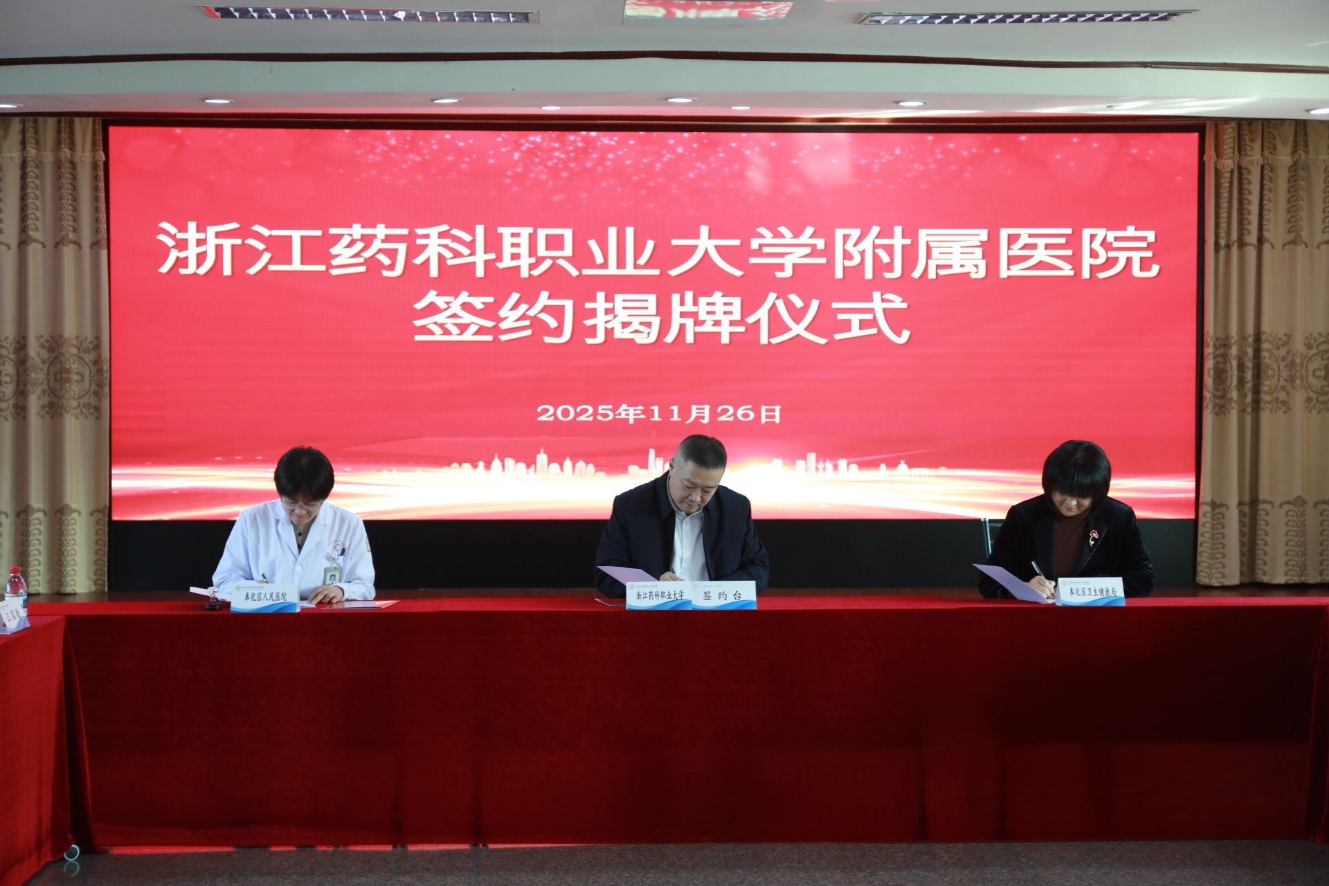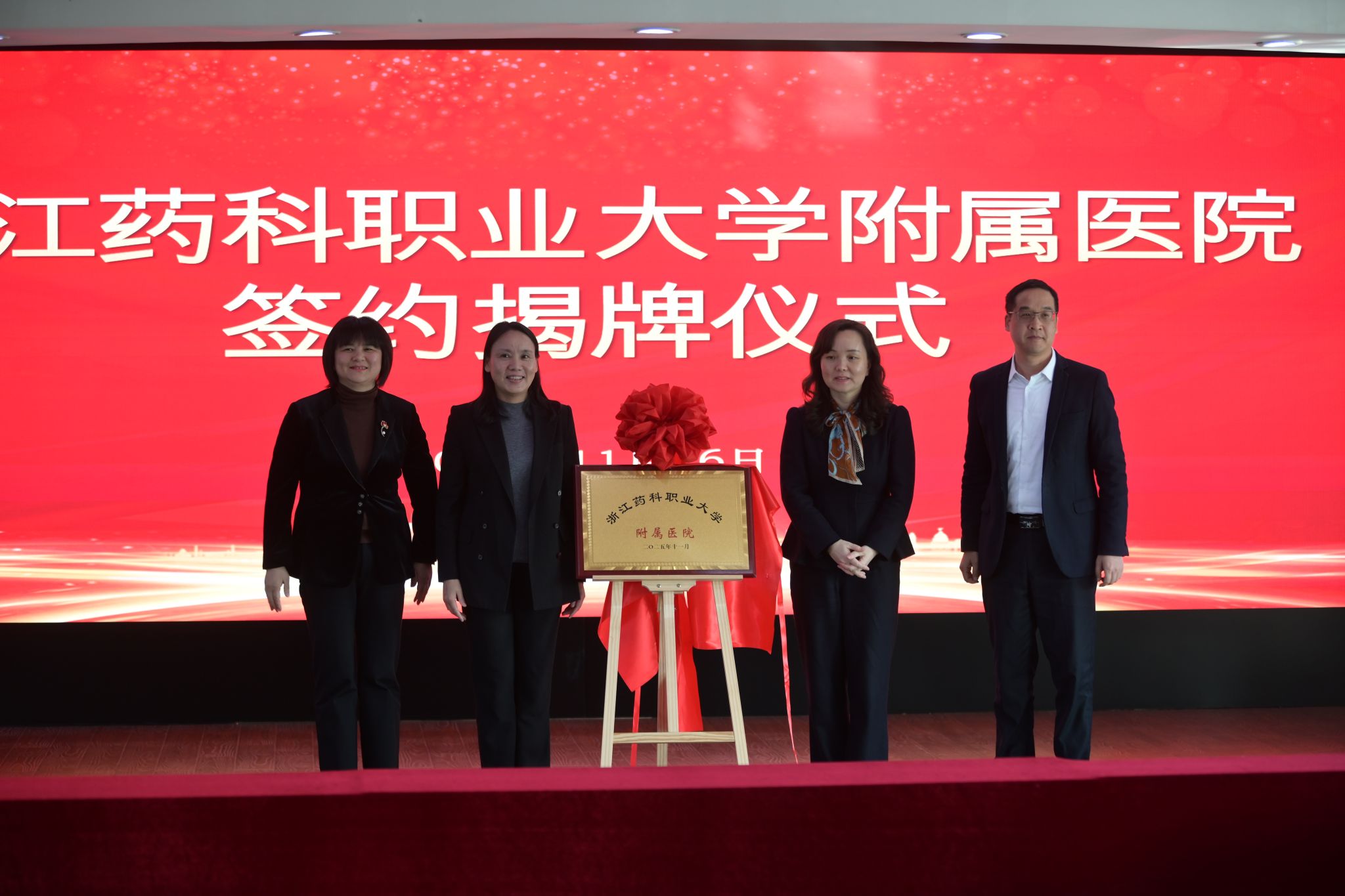 11月26日下午,浙江药科职业大学附属医院揭牌仪式在奉化区人民医院隆重举行。奉化区人民政府与奉化区卫生健康局共同见证了这一时刻。此次合作是校地双方深化医教协同、推进产教融合的关键一步。