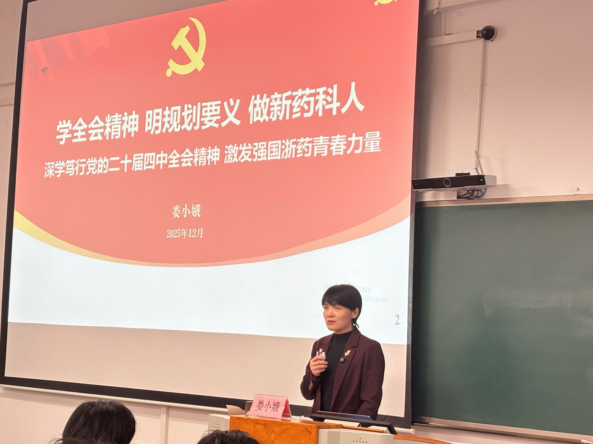 娄校长系统阐述了党的二十届四中全会的重大意义与“十五五”规划建议的核心要义。她围绕“国家要做什么”,理解“为什么这么做”“我们能做什么”展开宣讲。她指出,“十四五”时期我国发展取得历史性成就,为现代化建设奠定坚实基础;即将开启的“十五五”时期,是全面建设社会主义现代化国家的关键五年。她结合省委部署,强调必须牢牢把握高质量发展这一首要任务,加快发展新质生产力,并将这一宏观战略与医药健康领域的时代机遇紧密衔接。她表示,生物医药与健康产业正迎来前所未有的发展窗口,这也为学校“新药科”人才培养明确了方向、拓宽了舞台。