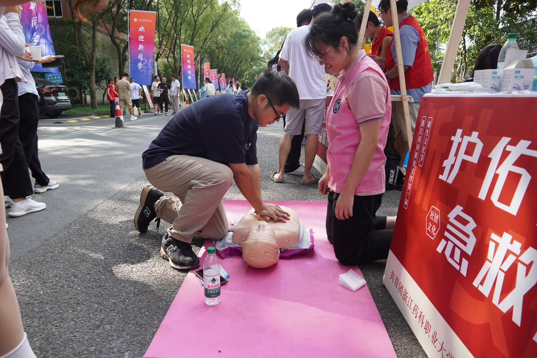 文化节不仅是文化的盛宴,更是专业教育的延伸与具象化。各专业学院纷纷亮出“看家本领”,打造户外移动课堂:护理学院的“生命守护”区,急救模型前围满了新生,在学长学姐指导下认真演练心肺复苏术;医疗器械学院的“器械探秘”展台,智能血糖仪、小型康复设备等模型揭开了现代医工科技的神秘面纱;药学院的“耳穴探秘”摊位前排起长队,一枚枚小小的耳穴贴,让中医“治未病”的智慧悄然入心;中药学院的“沁心茶饮”传递着本草的温润;药商学院的“活力养生”操则用动感节奏传递健康理念,新生跟跳后收获的护眼贴、养生手卡等更添专业关怀。“跳完操就领到实用的护眼贴,瞬间感受到了‘浙药’的专业温度!”药商学院的一位新生挥动着印有穴位图解的手卡笑着说。这些互动,在欢声笑语中悄然播下了职业理想的种子。